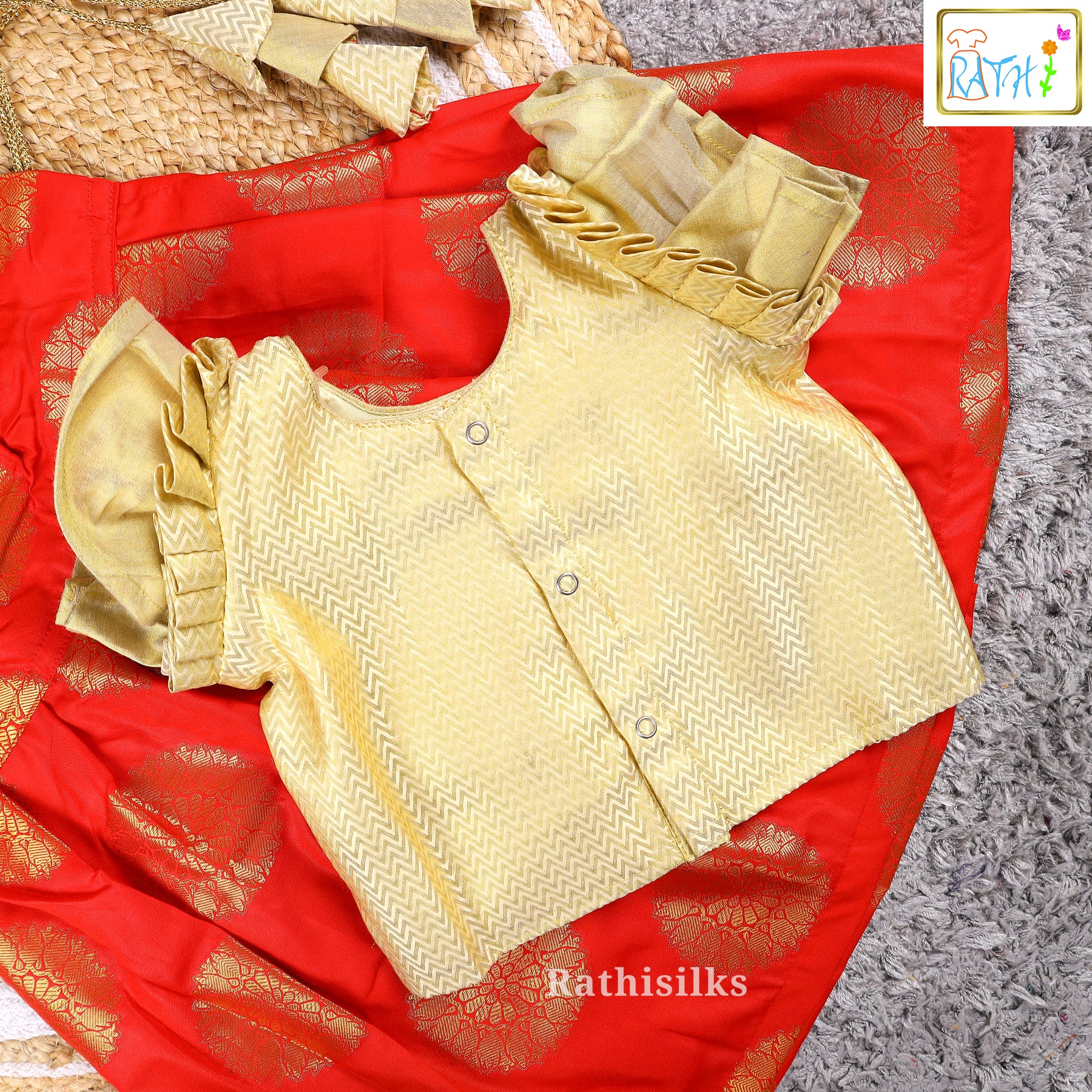 This Elegant Gold & Red Art Silk Pavadai Set beautifully showcases the richness of traditional South Indian attire. The golden art silk blouse features a subtle woven zigzag pattern along with stylish layered ruffle sleeves, adding a graceful festive touch. Paired with a vibrant red pavadai designed with stunning golden round zari motifs, this outfit exudes cultural elegance and charm. The pavadai’s broad golden zari border enhances its royal finish, making the ensemble perfect for festive occasions, weddings, temple visits, and family celebrations. Soft, lightweight, and comfortable, this pavadai set is an ideal choice for little girls who love traditional dressing.
