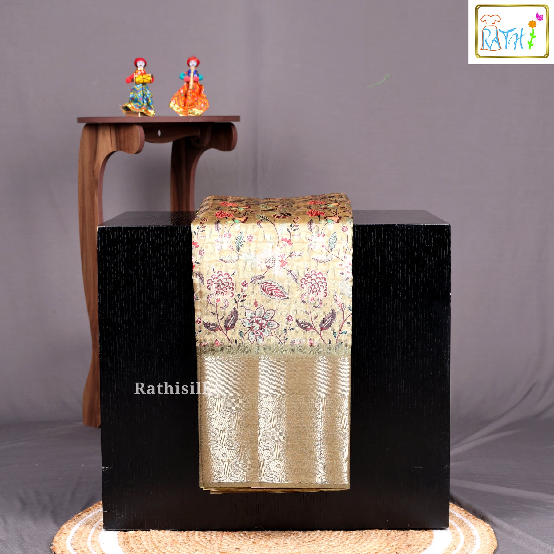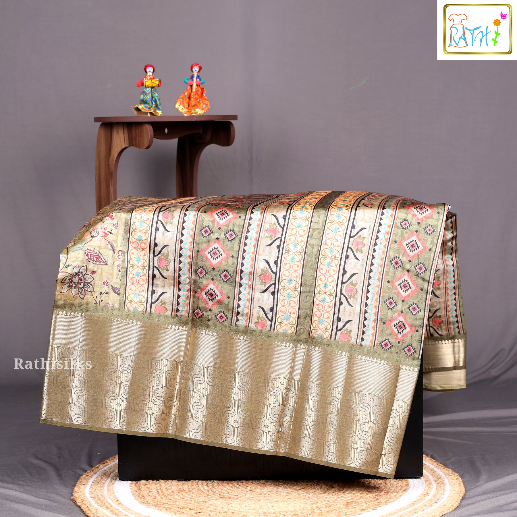 Green Synthetic Saree with Multicolor Floral Print & Elegant Woven Border