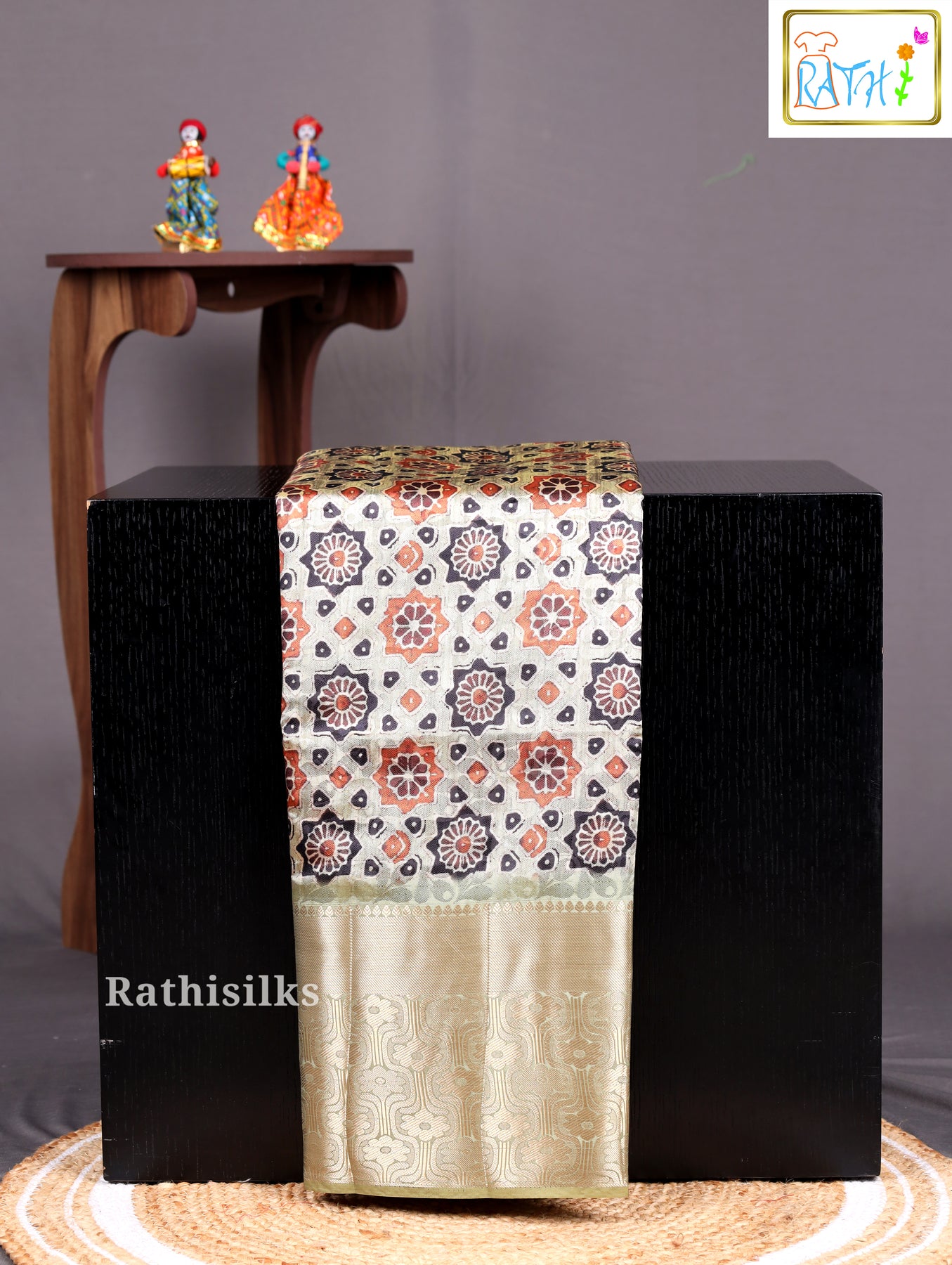 Green Synthetic Saree with Geometric Floral Print & Elegant Zari Border