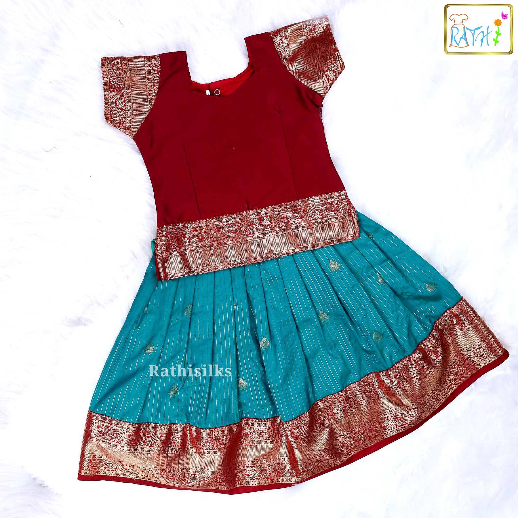 The pavadai is made from soft art silk with golden zari butta weaving throughout, giving it a subtle shimmer. The border is richly woven in matching maroon and gold, adding grandeur and charm. Designed with pleats for comfortable flare and movement, this outfit ensures style along with ease for little ones.