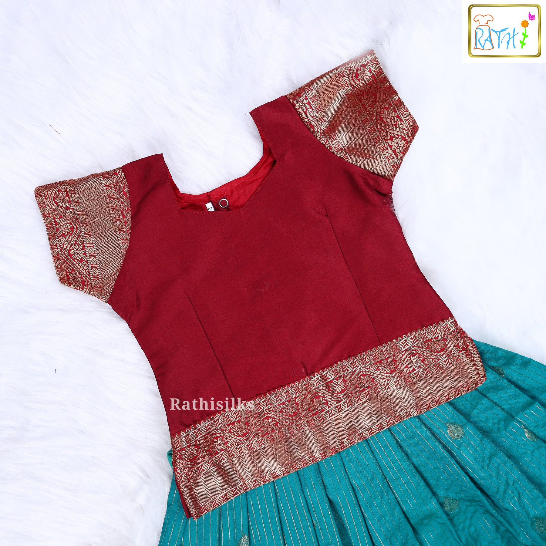 Karishma Top with Art Silk Pavadai Set for Girls – Maroon & Teal Combination