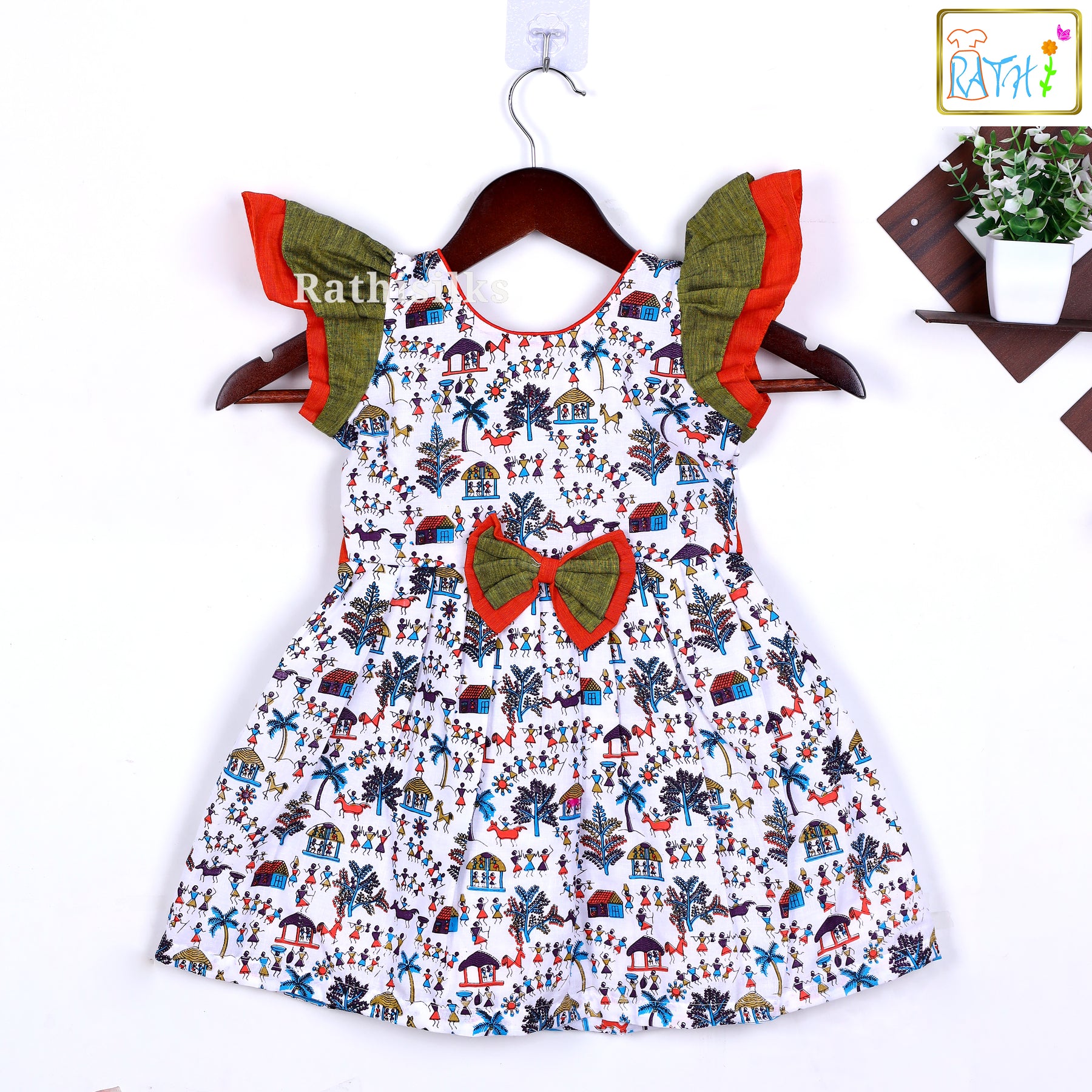 The sleeves come in a dual-tone frill design in olive & rust shades, adding extra cuteness to the outfit. A beautiful contrasting bow at the waist enhances the look, giving the frock a stylish touch. Made from soft Mangalagiri cotton fabric, it ensures comfort throughout the day—perfect for active and playful kids.