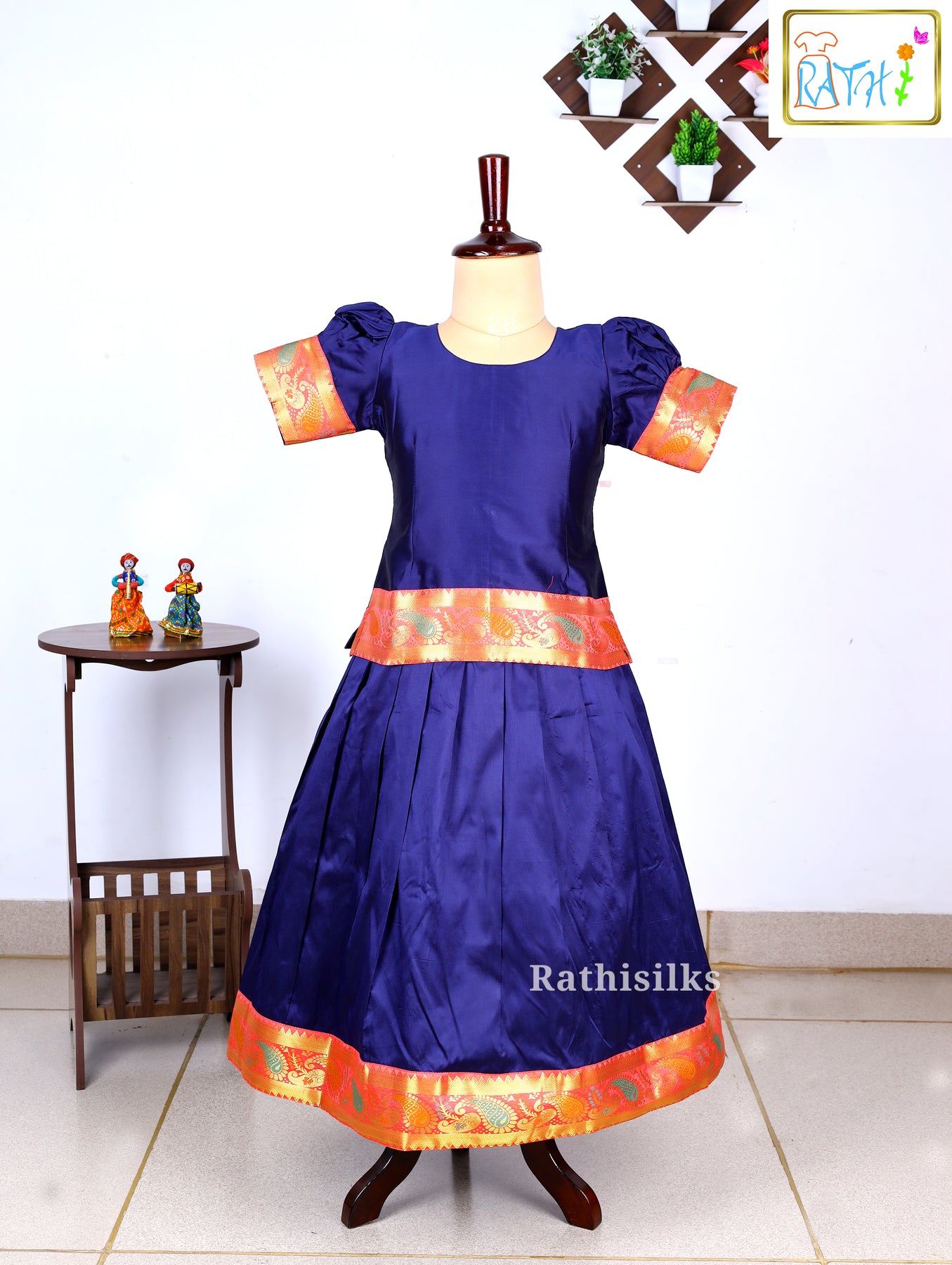 • Pavadai Color : Navy Blue with Orange-Gold Zari Border