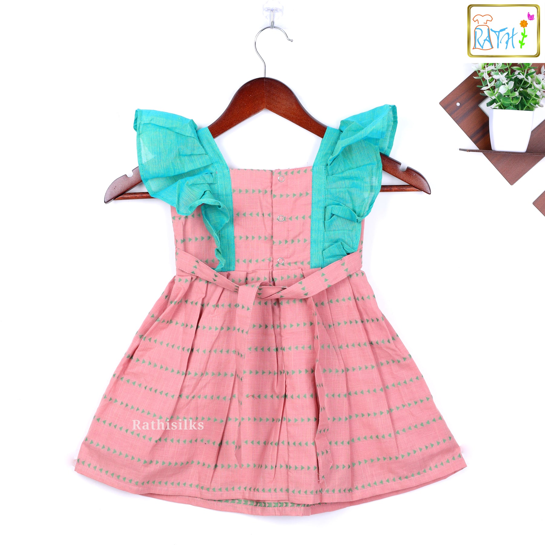 This adorable frock offers a contemporary, playful take on ethnic wear. The main body of the dress is a soft dusty or pastel pink fabric, featuring subtle horizontal lines of small teal arrow or triangle motifs. The skirt is gathered with neat pleats, giving it a soft, full shape. The contrasting aqua/teal fabric forms charming, voluminous ruffle cap sleeves that frame the shoulders and bodice. The bodice itself is simple, featuring a single contrasting button detail on the chest. This comfortable, light-weight dress is perfect for casual parties, playdates, and everyday ethnic or fusion wear.