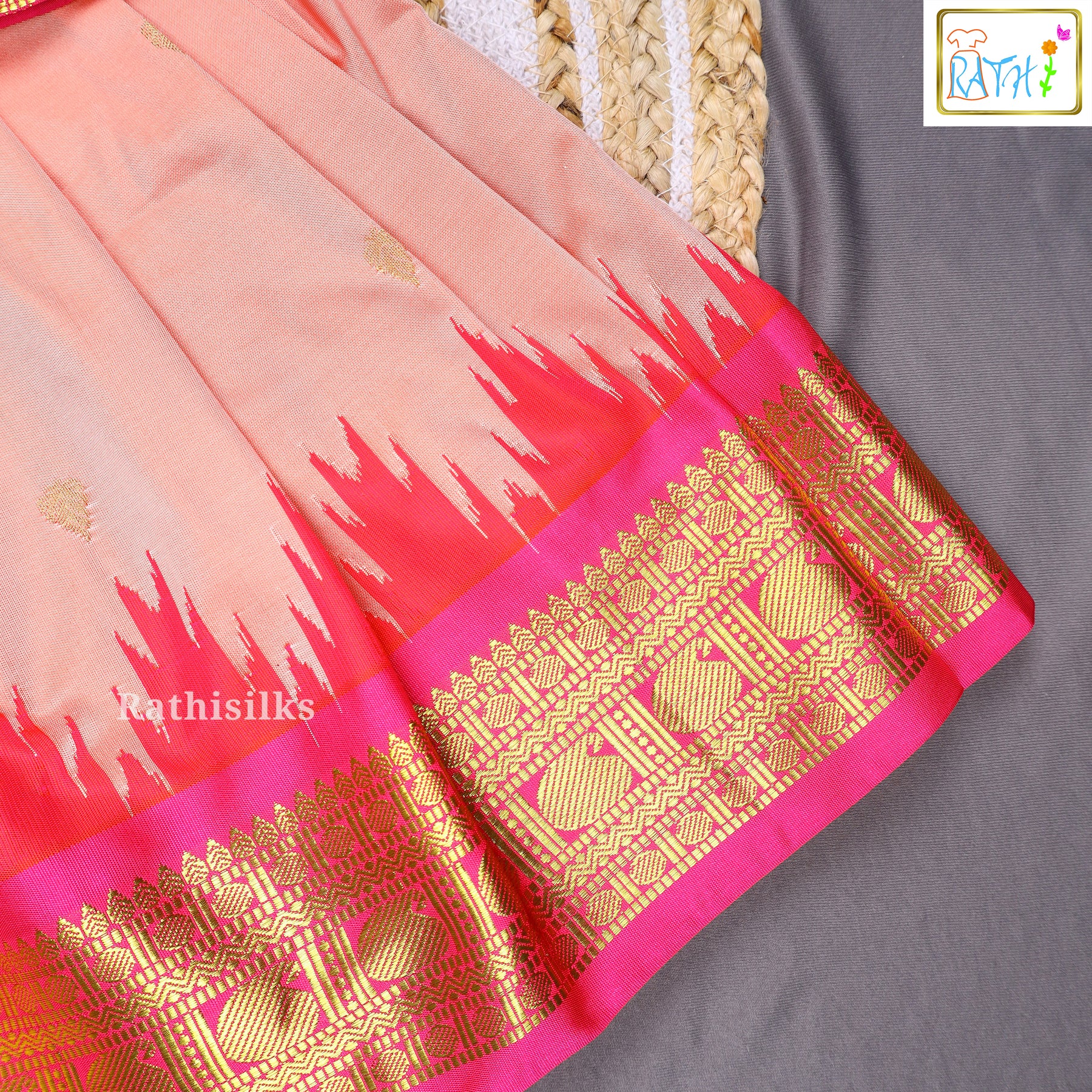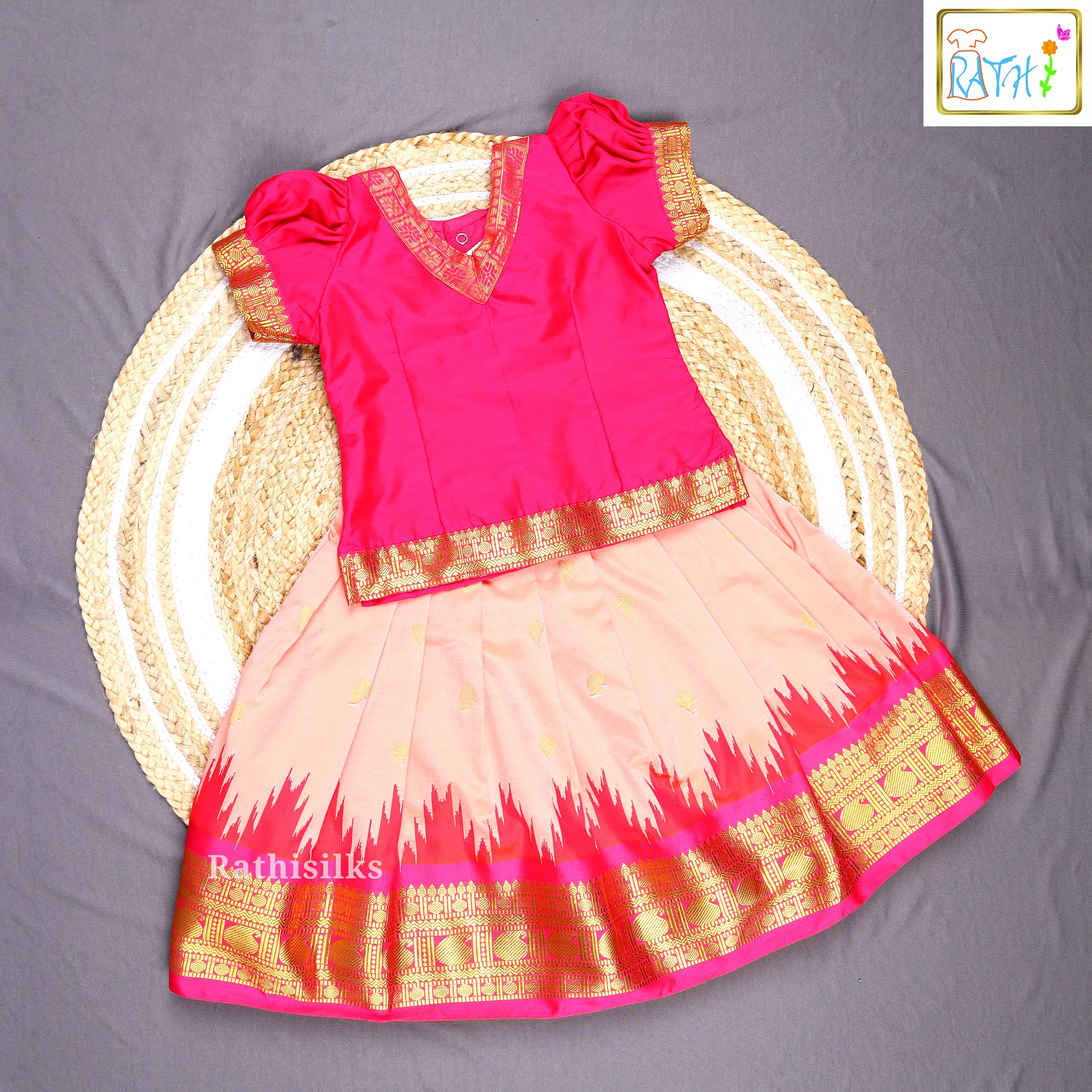- Pavadai Color : Peach with Pink & Gold Zari-Style Border