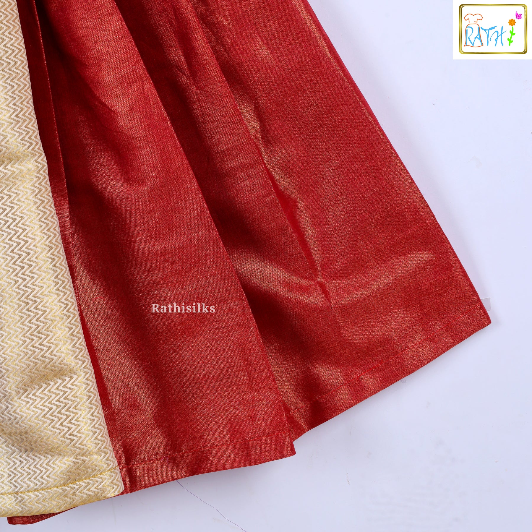 Add festive charm to your little one’s wardrobe with this graceful Red & Gold Tissue Frock. Made from premium tissue fabric, the frock features a vibrant red base accented with a golden pleated yoke and a stylish gold woven panel in the front. Designed with a round neckline and sleeveless pattern, it blends traditional elegance with modern comfort. With its soft cotton lining and easy back closure, this frock is perfect for long festive hours, temple visits, weddings, or cultural gatherings.