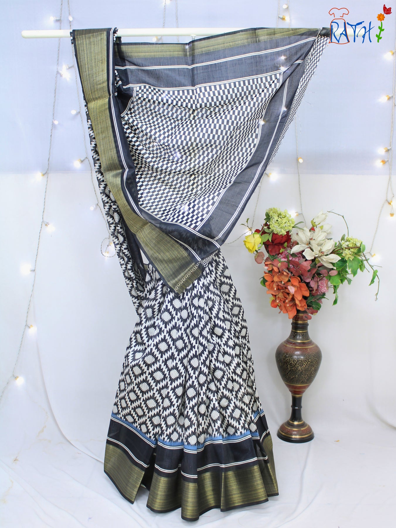 Keep it classic with this elegant Black & White Semi-Chanderi Saree featuring a timeless checkered design and a rich gold border. Lightweight and perfect for summer wear, this saree is an excellent choice for both casual and festive occasions. The contrast of black, white, and gold makes it a statement piece for your ethnic collection.