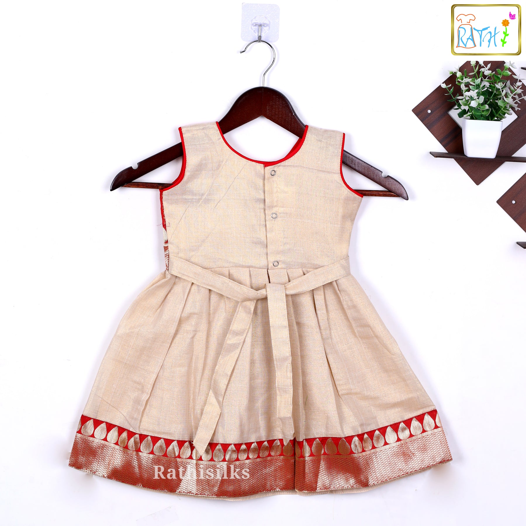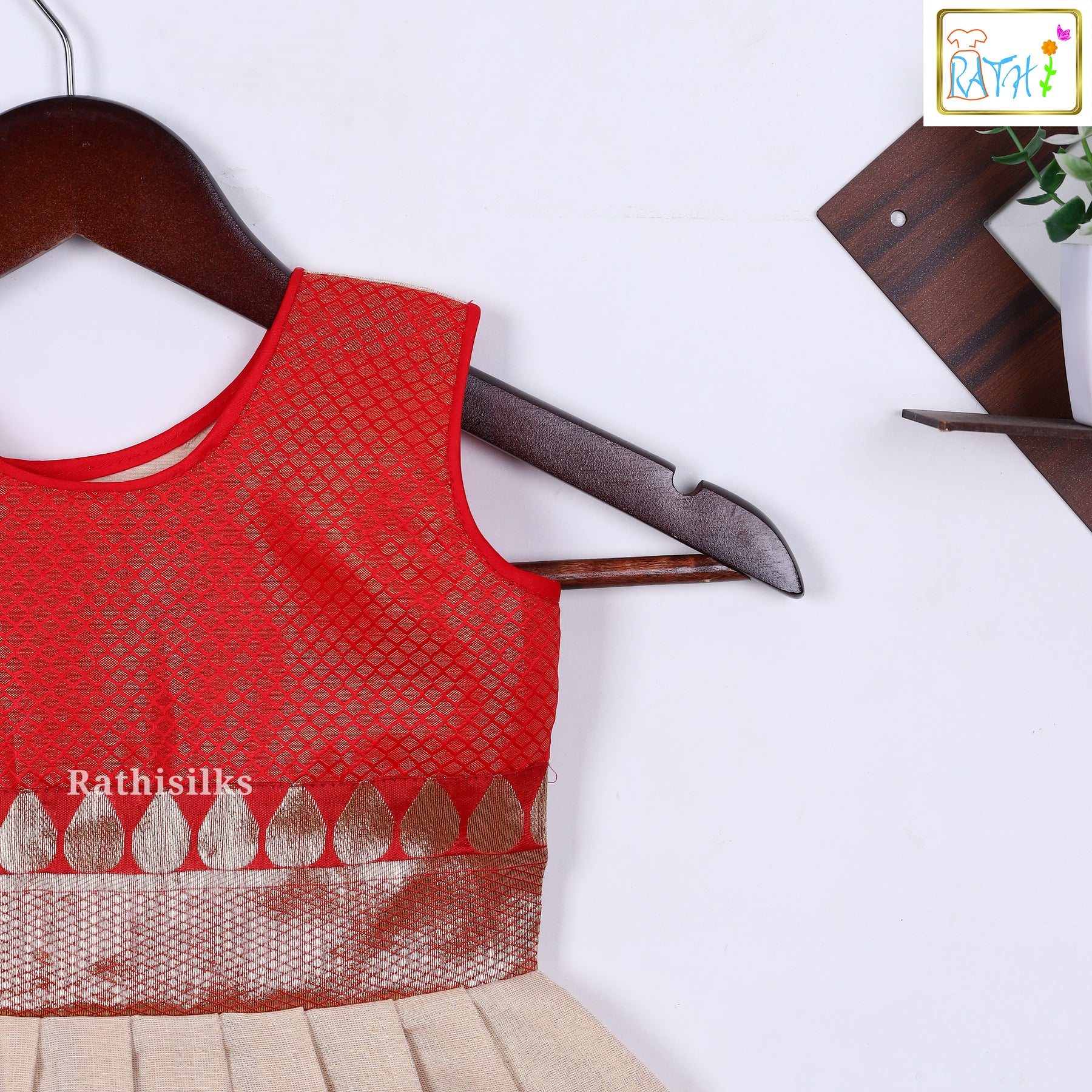 This stunning Red & Cream Tissue Frock is crafted to bring in festive elegance with a luxurious traditional finish. The bodice features a rich red shimmery tissue fabric with a subtle woven texture, highlighted beautifully by a sparkling gold lotus zari panel at the waist. The cream pleated skirt flows gently, offering a soft flare and graceful movement with every step.