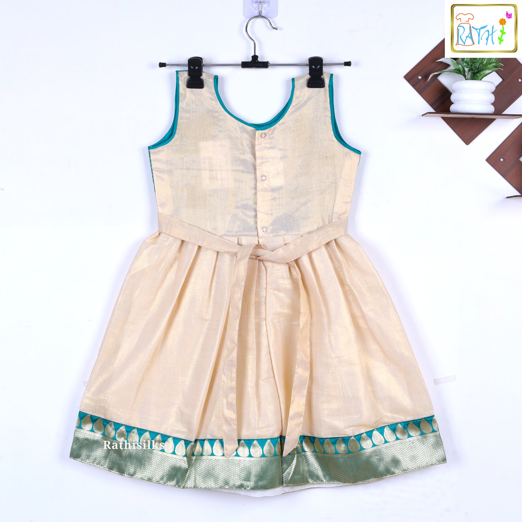 Let your little one shine in traditional splendor with this beautifully crafted cream tissue frock. Featuring a vibrant green yoke with woven zari patterns and matching temple-style zari border along the hem, this frock captures the richness of South Indian heritage. The flare of the tissue skirt adds grace and charm, while the sleeveless cut ensures all-day comfort. Perfect for festive occasions, family ceremonies, or temple visits, this outfit combines tradition with elegance and ease.