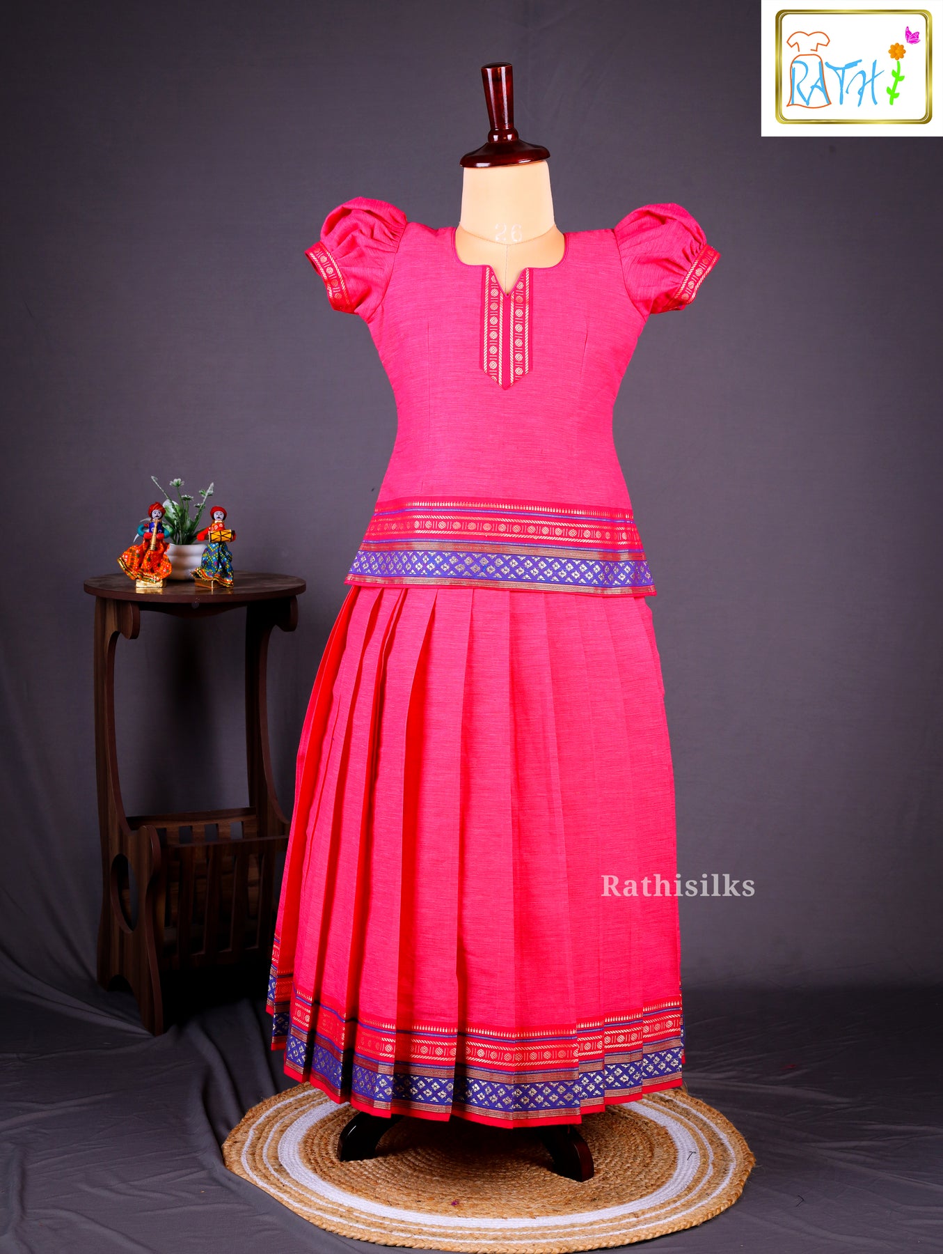 Traditional Pink Mangalagiri Cotton Pavadai Sattai for Girls – Elegant Ethnic Wear with Zari Border & Pleated Skirt