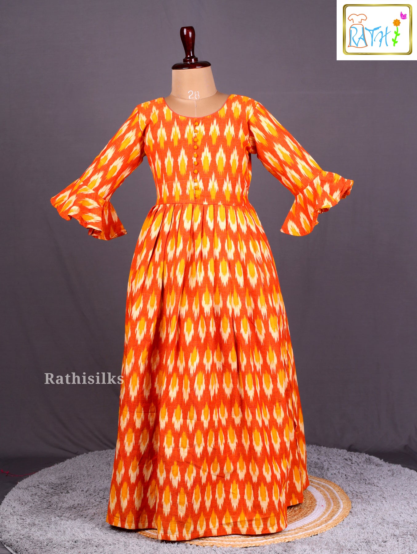 Trendy Orange Ikat Cotton Frock for Girls with Flared Sleeves