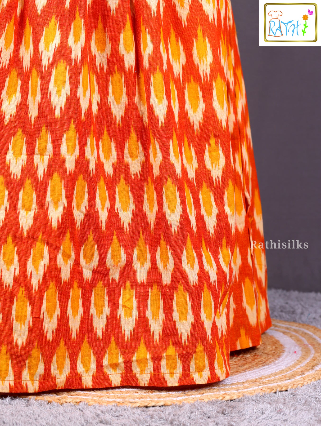 - Pattern : Woven Ikat design in orange, yellow & white