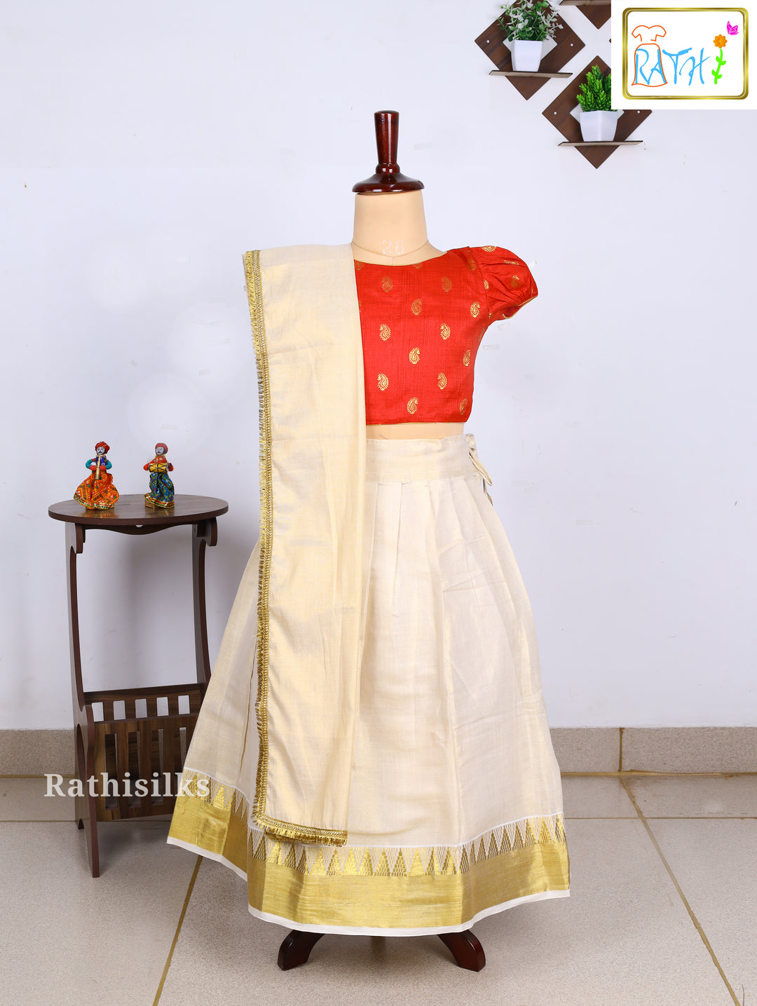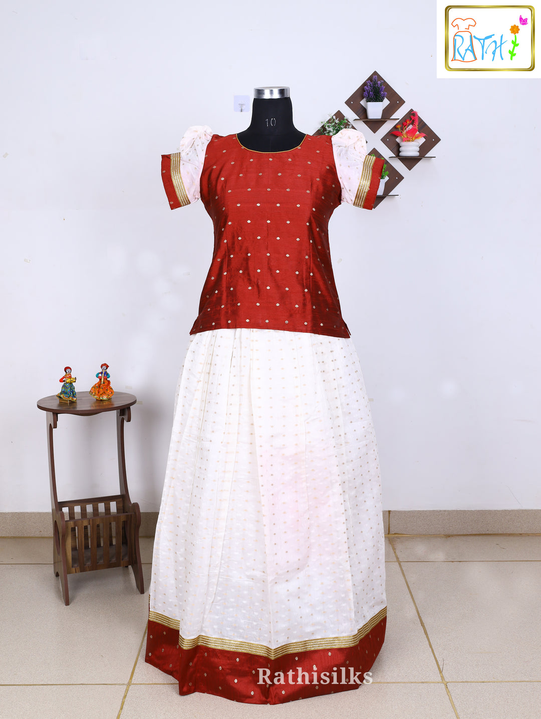 Maroon Top & Off-White Kerala Kasavu Pavadai Set