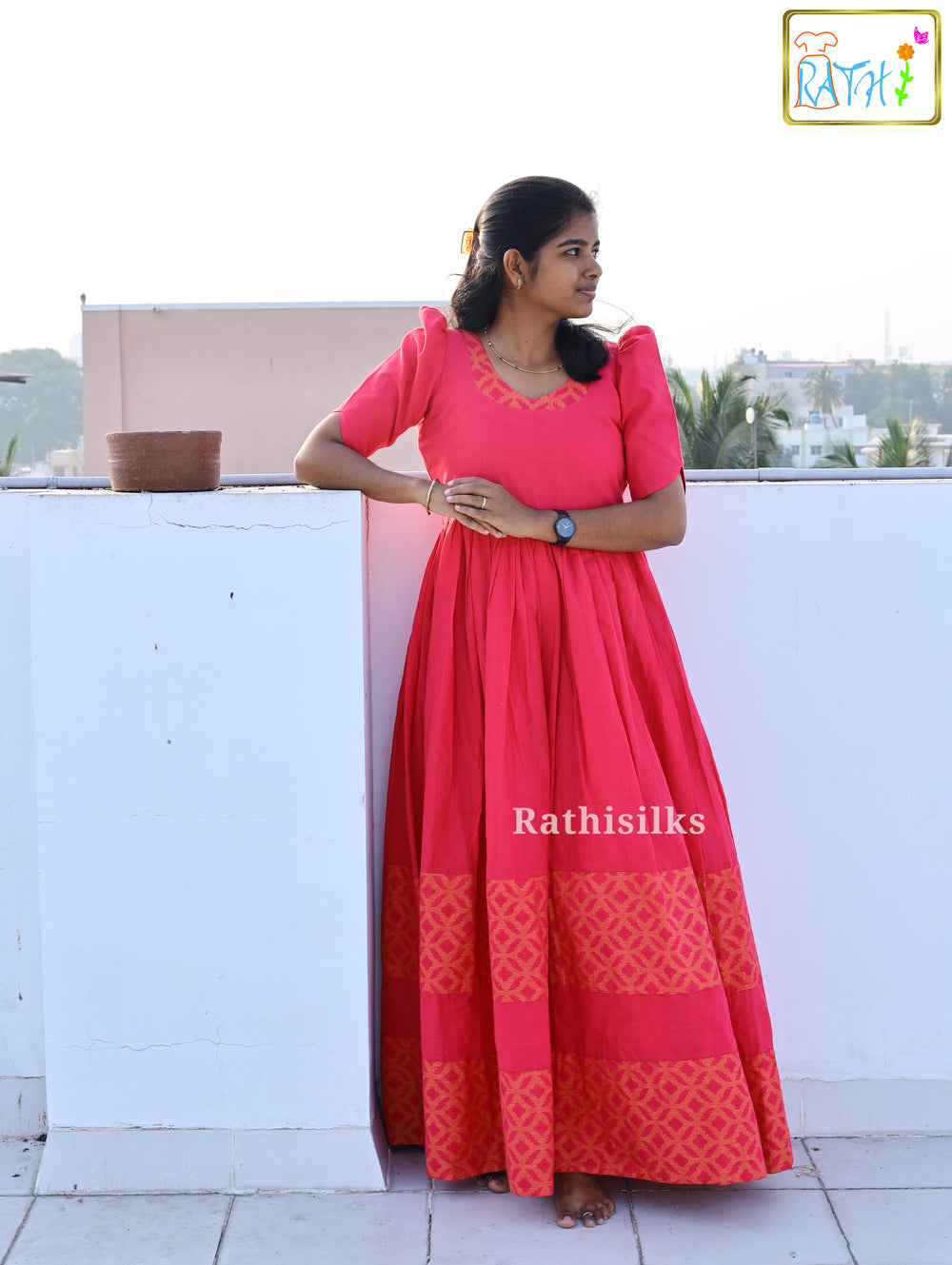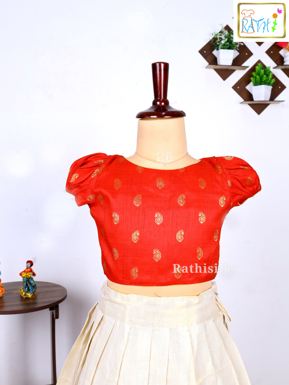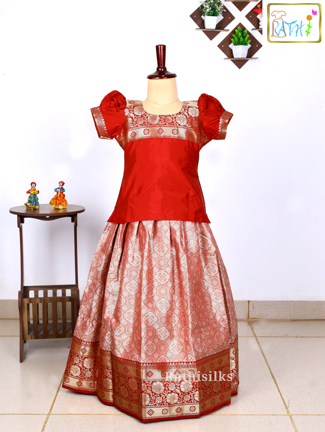 Red Karishma Top with Rose Gold Art Silk Pavadai Set