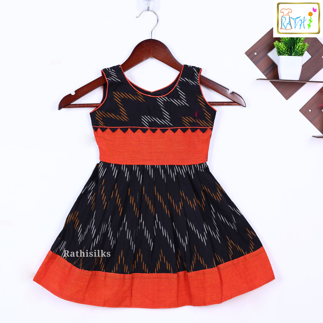 Elegant Black & Orange Ikat Cotton Frock