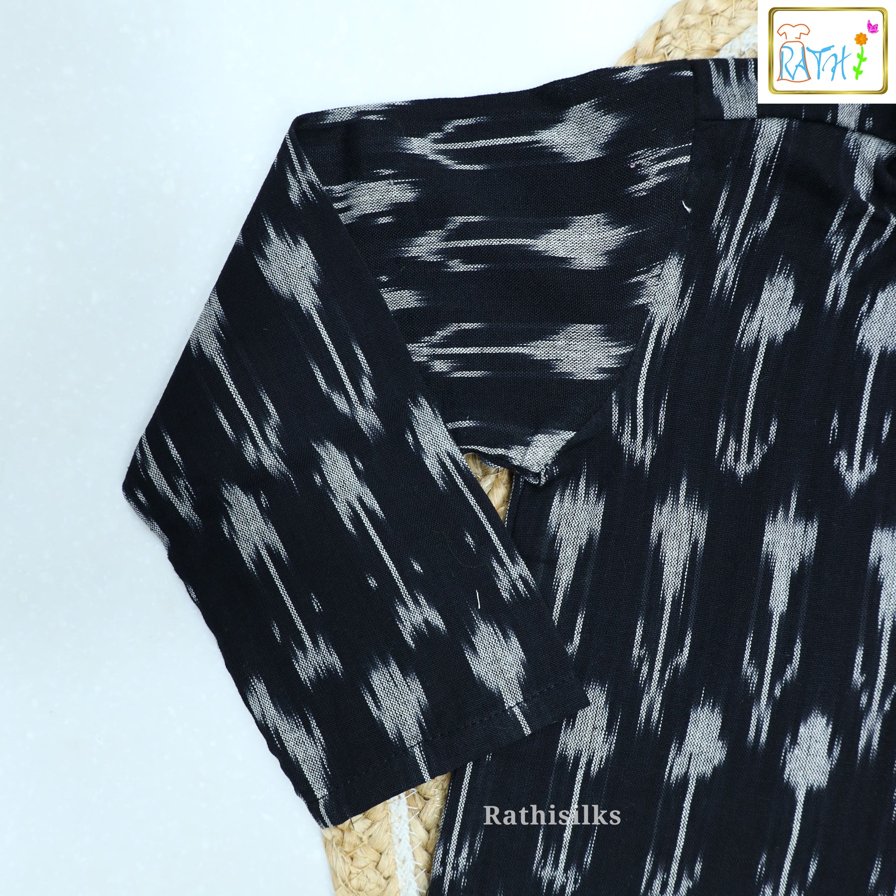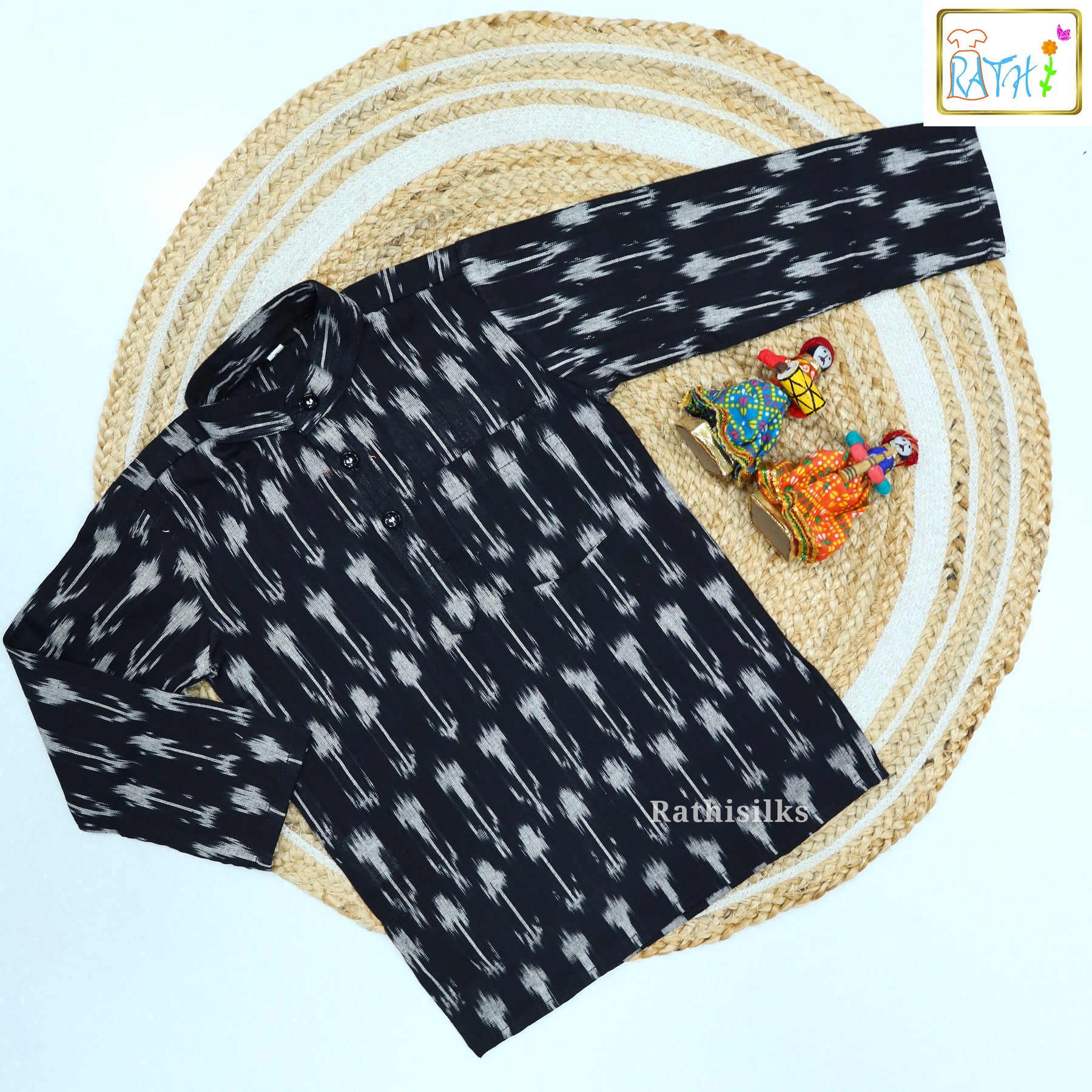 Give your child a refined and stylish ethnic look with this Boys Ikat Cotton Printed Kurta. Crafted from premium quality pure cotton, this kurta features a classic ikat print in elegant charcoal black and white tones. The soft, breathable fabric ensures maximum comfort, making it ideal for long wear. Designed with a mandarin collar, button placket, and full sleeves, this kurta is perfect for festive occasions, family gatherings, and casual traditional outings.