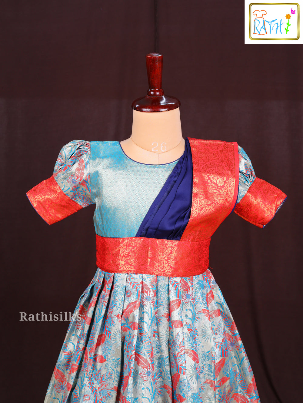 Peach & Teal Art Silk Floral Brocade Stitched Saree Dress