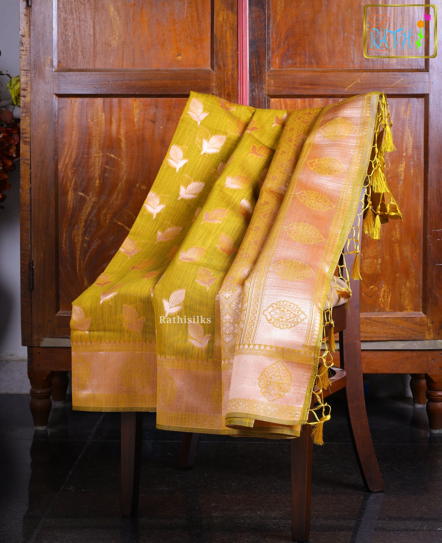 · Striking mustard yellow body with woven leaf motifs in soft rose-gold zari