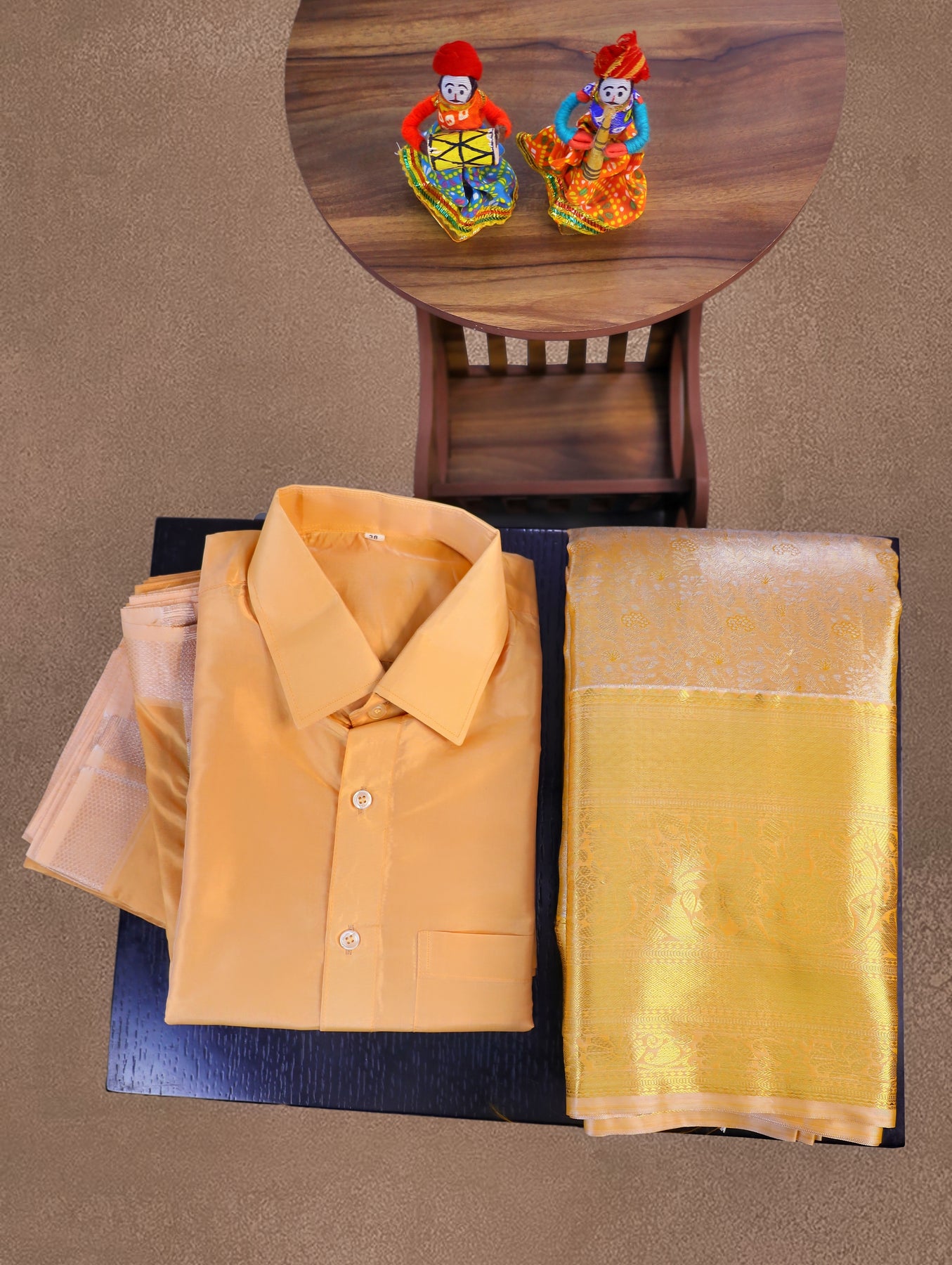 Premium Art Silk Couple Combo Set – Orange Saree with Matching Dhoti & Shirt