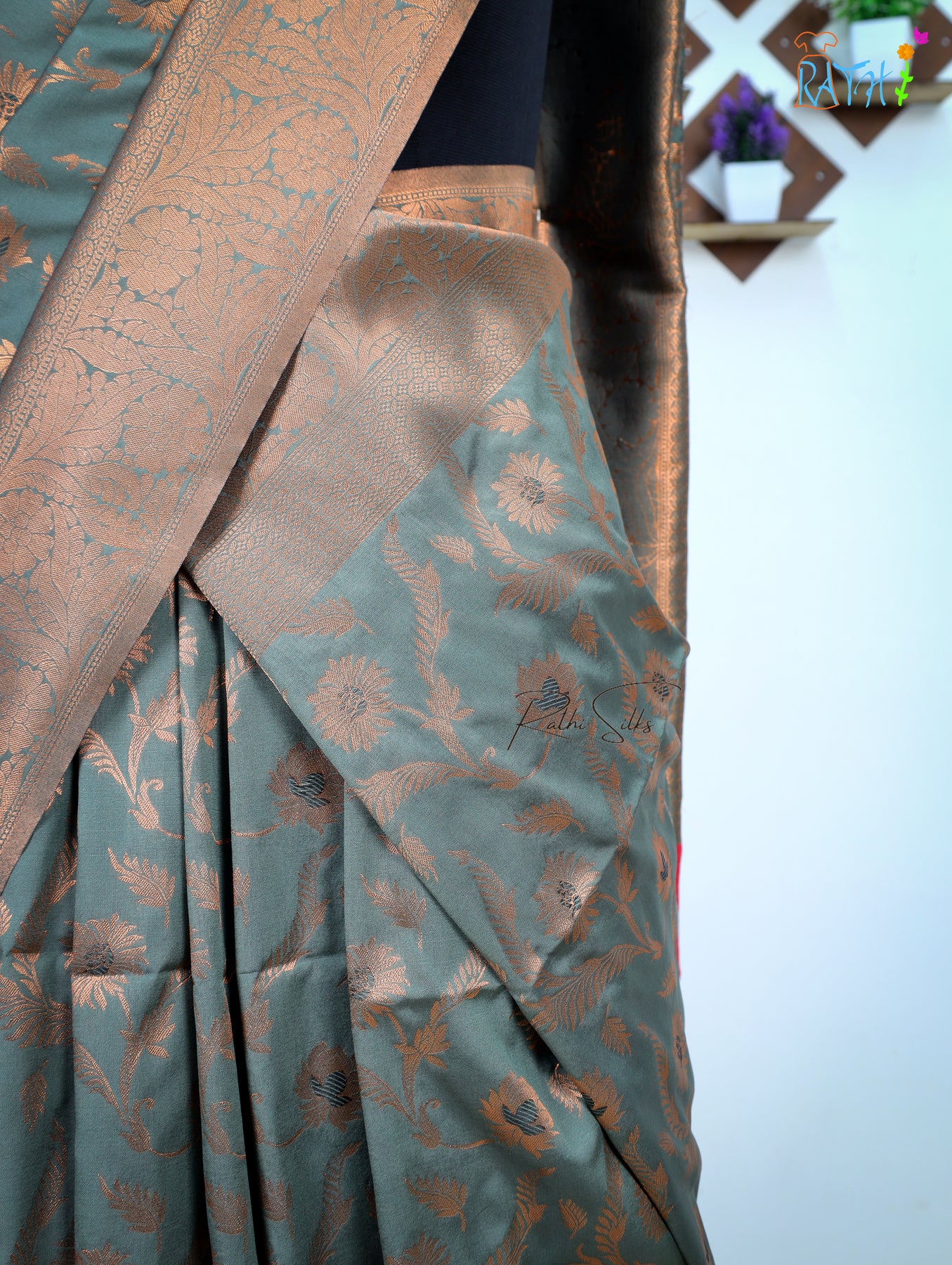Slate Green Art Silk Saree with Copper Floral Zari Motifs and Elegant Woven Pallu