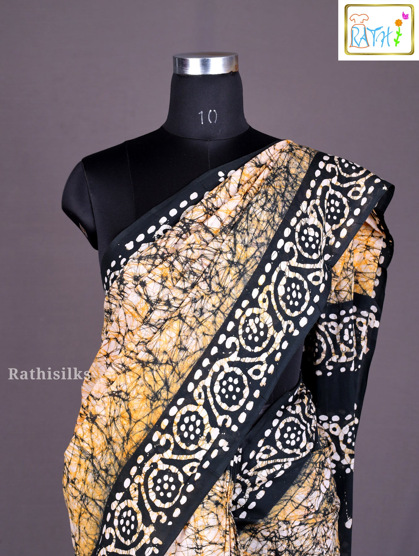 Elevate your ethnic wardrobe with this striking Batik-print cotton saree, showcasing a beautiful fusion of traditional artistry and modern style. Crafted from soft and breathable cotton, this saree features a classic black and golden-yellow color palette. The body of the saree has an intricate, crackle-effect batik pattern in golden tones, while the broad black border and pallu are adorned with bold, circular and floral motifs. Perfect for a variety of occasions, this unique saree offers both comfort and a distinct, artistic appeal.