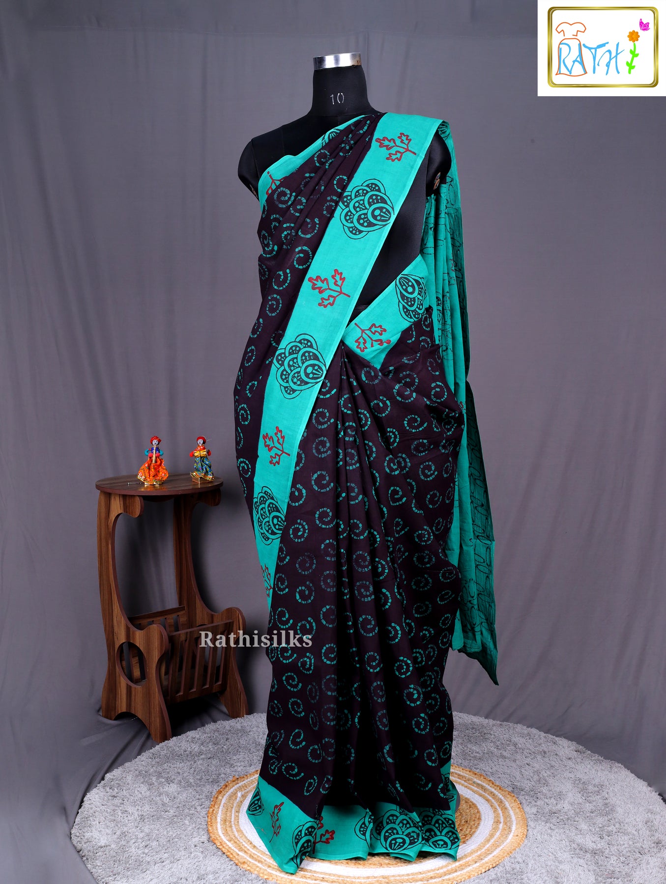 Step into elegance with this exquisite black and teal pure cotton saree, designed to bring a touch of tradition to any occasion. Featuring a contrasting teal border adorned with beautiful floral and leaf motifs, this saree brings out bold sophistication. The rich black base is complemented by intricate patterns, making it an ideal choice for casual outings, festive occasions, or temple visits. Crafted from soft, breathable cotton, it offers ultimate comfort while draping gracefully around you. Pair it with your favorite blouse for a complete look.
