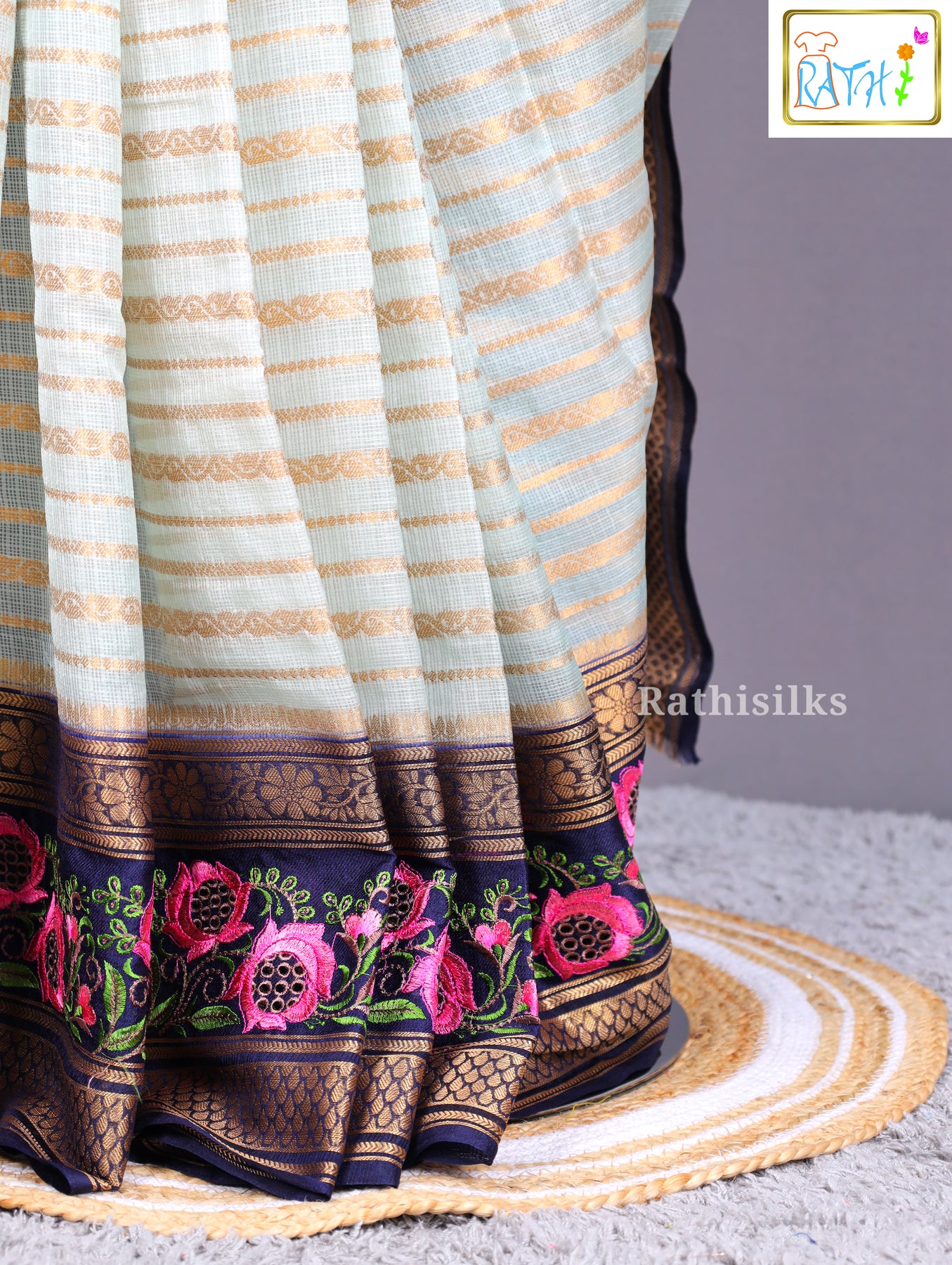 This exquisite synthetic saree features a soft light green base with delicate striped patterns, perfect for creating an elegant look. The saree is highlighted with vibrant pink floral embroidery along the border, adding a beautiful contrast to the subtle fabric. The dark navy-blue border beautifully frames the saree, accentuating the floral designs. Crafted from lightweight synthetic fabric, this saree drapes effortlessly, making it a perfect choice for both casual and semi-formal events. It is ideal for occasions where you want to combine elegance and comfort.