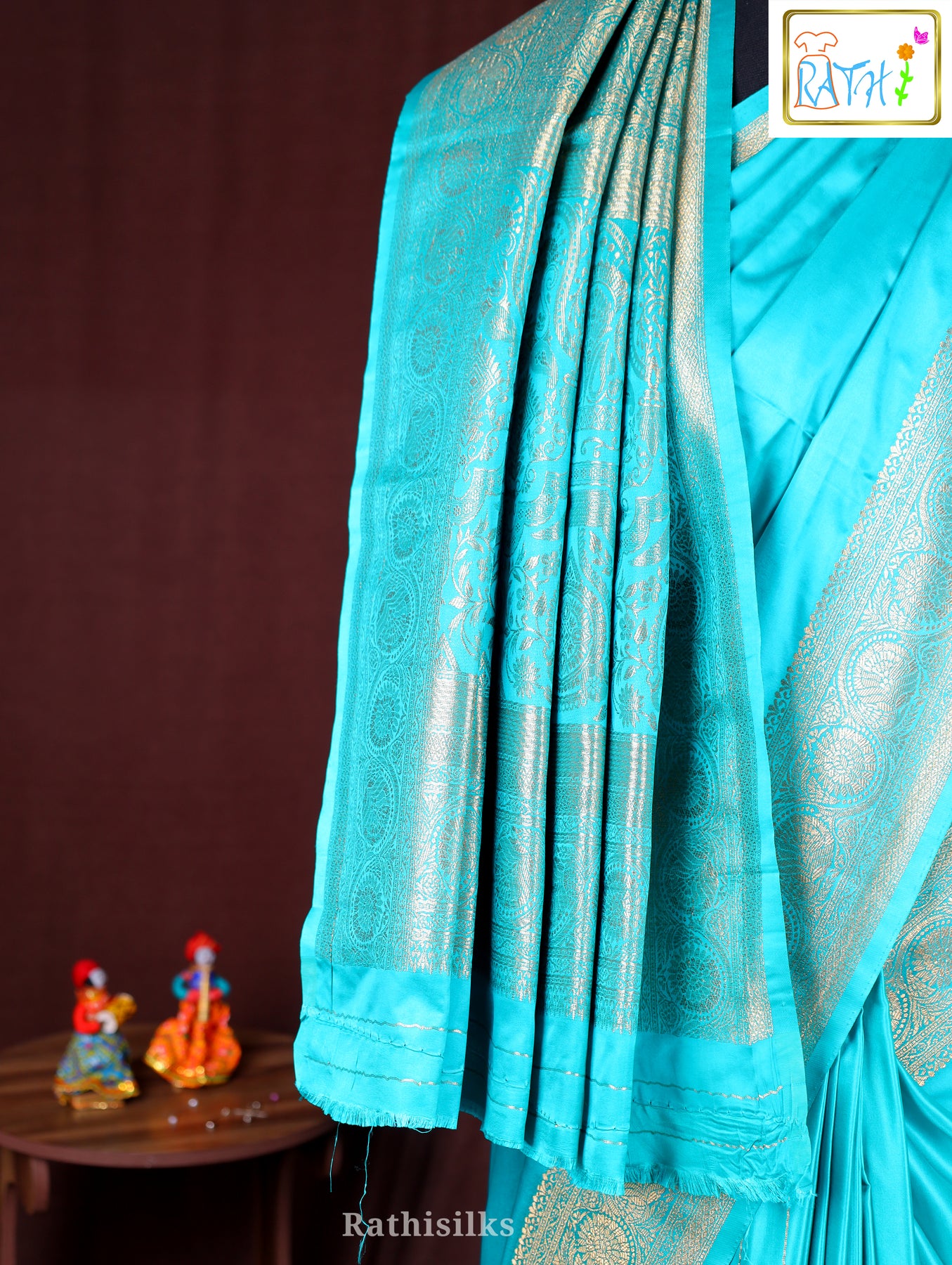 ·         Color : Turquoise Blue with Golden Zari Border & Pallu