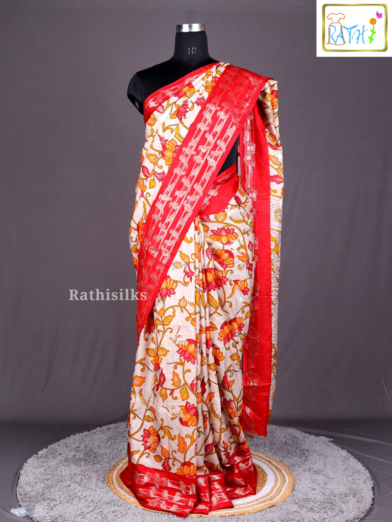 Elegant Floral Printed Red & Beige Synthetic Saree with Brocade Border
