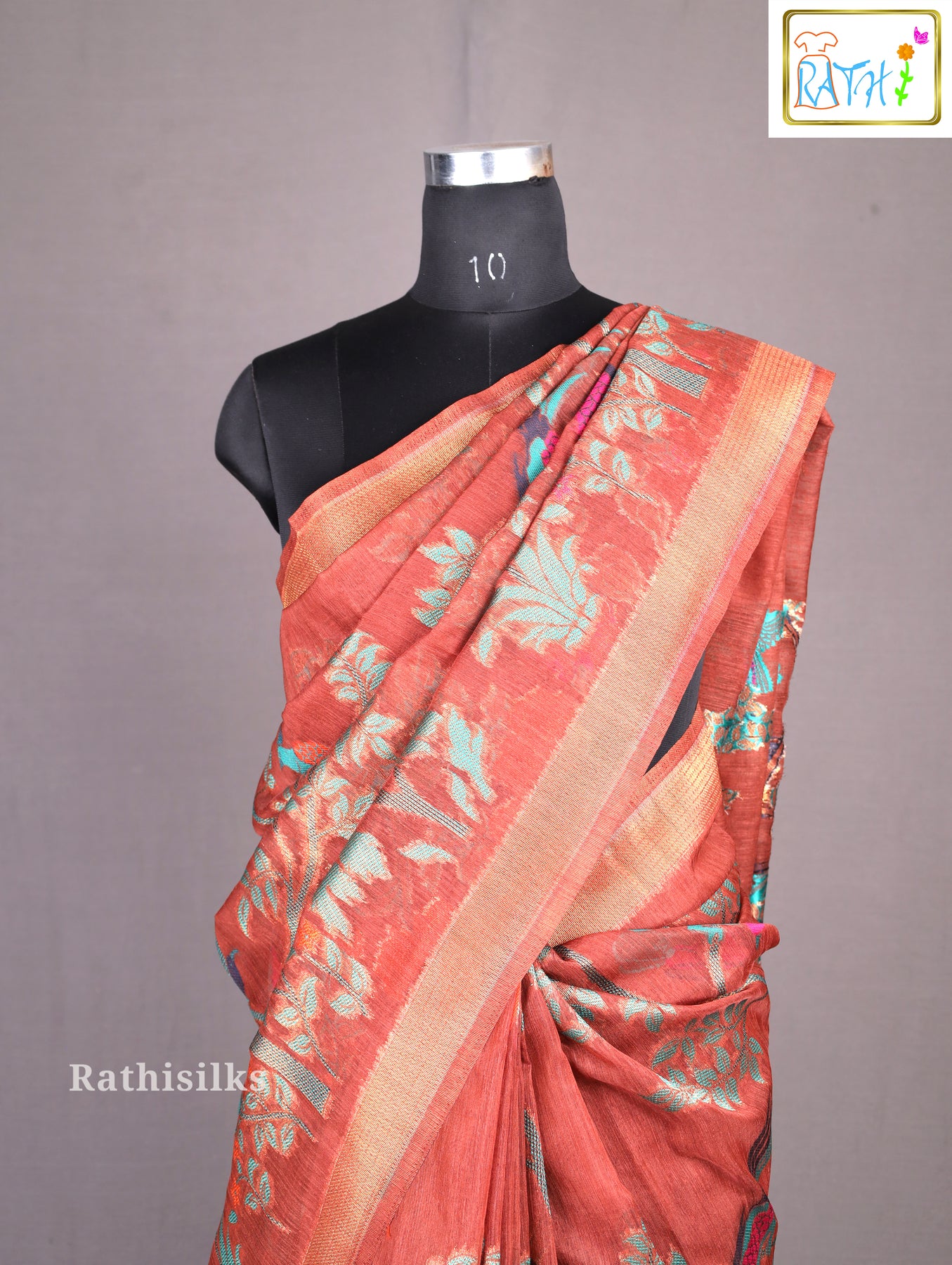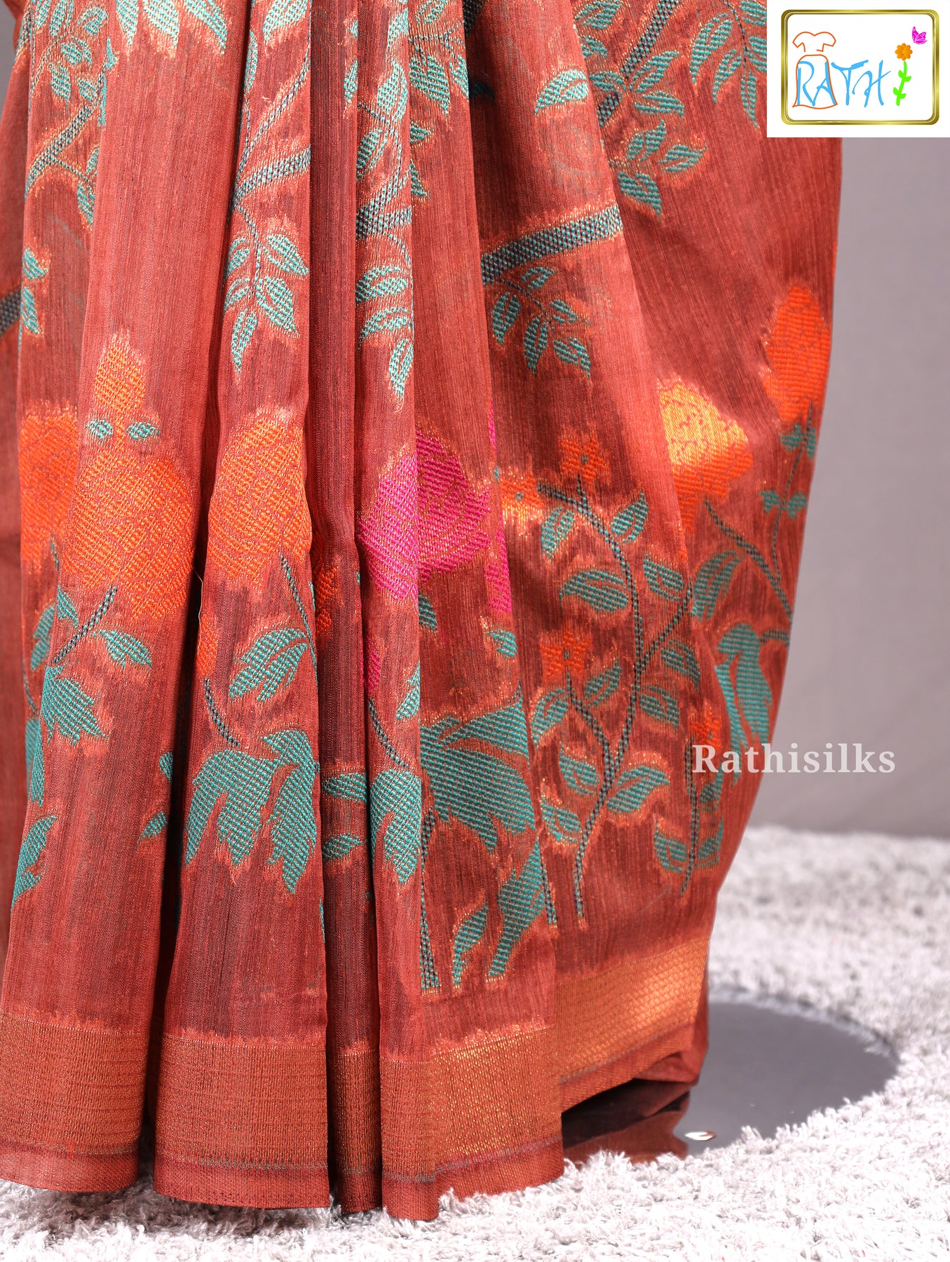 Step into a world of delicate charm with this Rust Synthetic Saree. The saree features a soft, translucent body dotted with subtle shimmering accents. Its most captivating feature is the exquisite floral embroidery that runs along the border and pallu, creating a beautiful and intricate design. The floral patterns, in shades of teal, orange, and gold, stand out elegantly against the warm rust background. Made from a lightweight, easy-to-drape synthetic fabric, this saree is perfect for special occasions where you want to look effortlessly elegant.