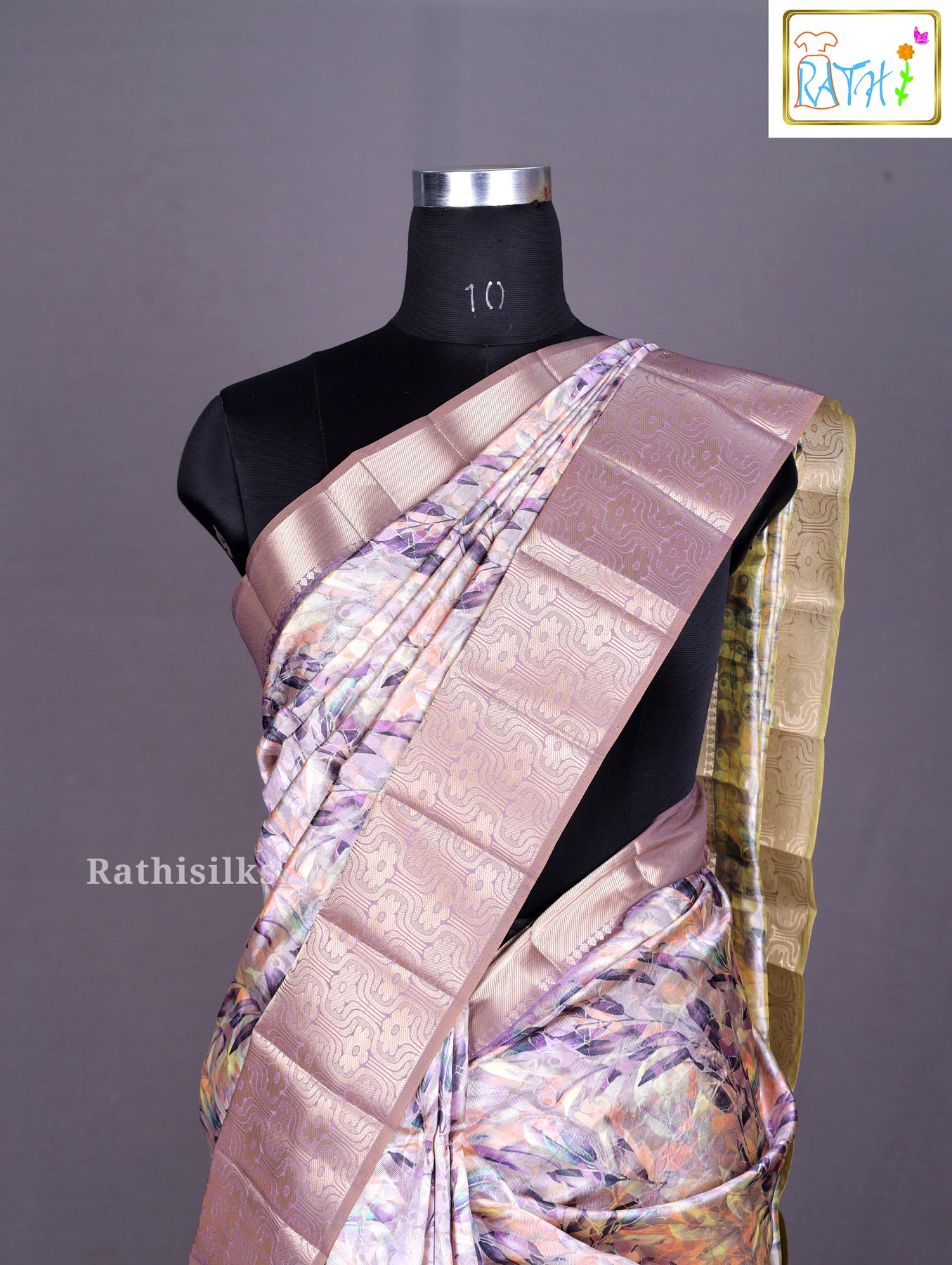 ·         Color : Body in Mauve/Multi-Tone Pastel with an abstract print; Border in deep Bronze/Antique Gold.