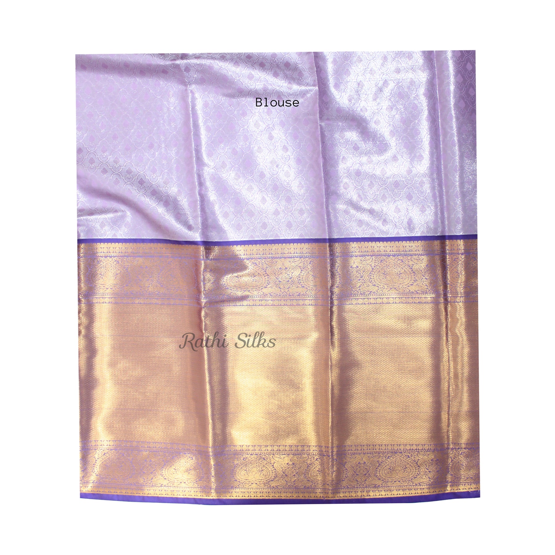 Elevate your ethnic wardrobe with this graceful lavender and gold art silk saree, adorned with intricate gold zari woven patterns. The lavender body offers a subtle, regal sheen, beautifully offset by the broad golden zari border and a luxurious pallu rich with traditional detailing. Perfect for weddings, festive occasions, and formal gatherings, this saree captures the sophistication of pure silk while offering the lightness and easy care of art silk. It includes a matching unstitched blouse piece to complete your polished, elegant look.