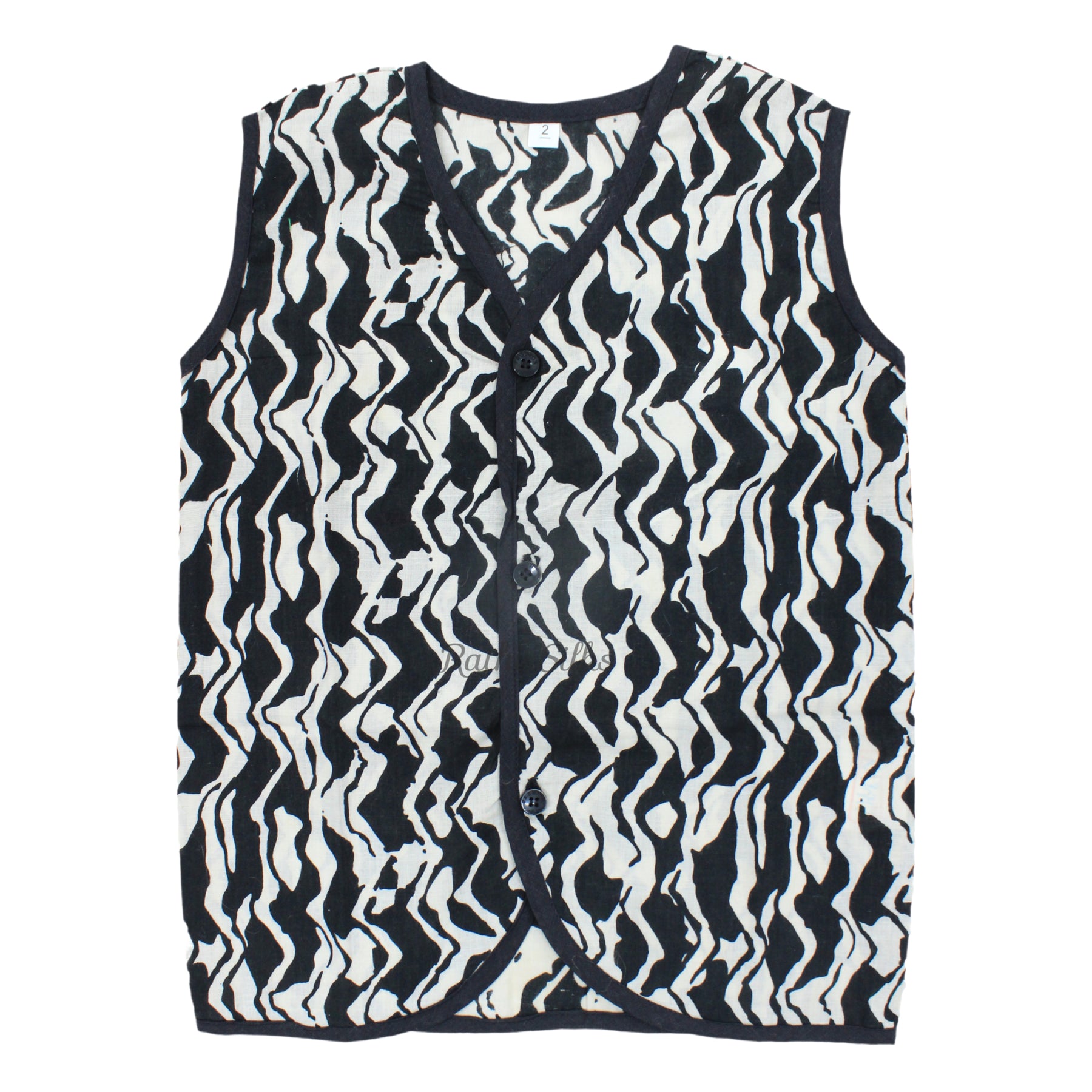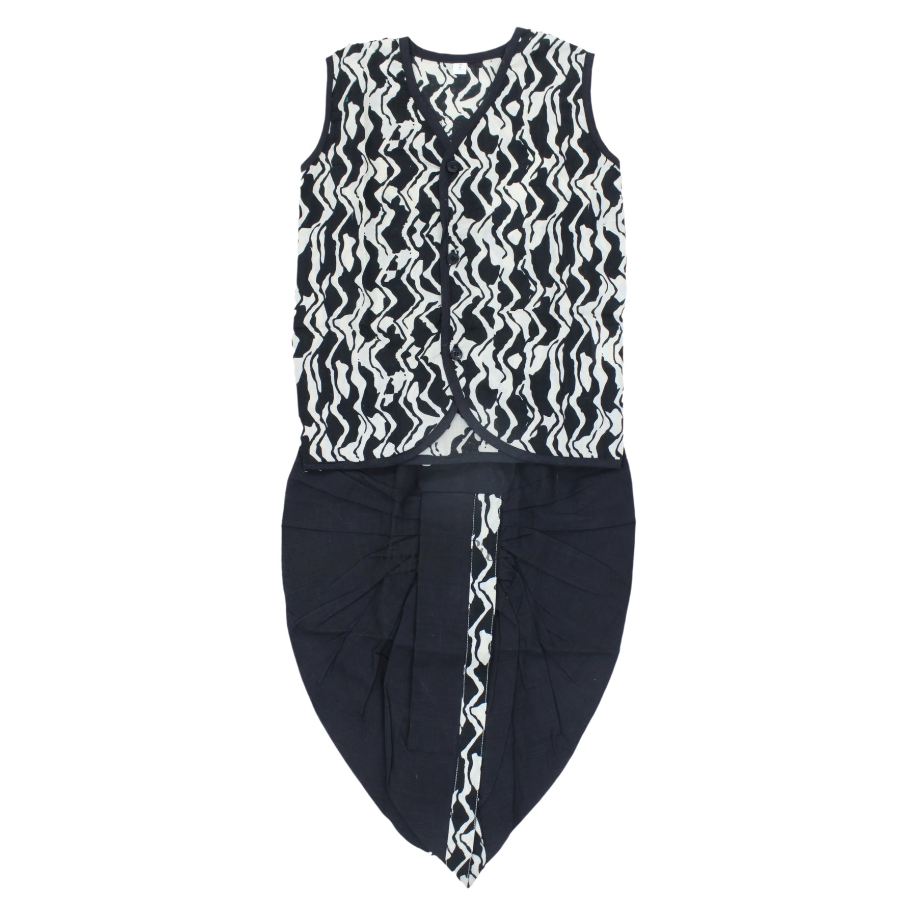 This Boys Ikat Cotton Printed Panjagajam Set features a striking black and white ikat printed sleeveless vest with neat contrast piping and front button closure, paired with a solid black cotton panjagajam highlighted by a matching ikat border strip. Crafted from pure ikat cotton, this outfit offers comfort, breathability, and a bold traditional look.