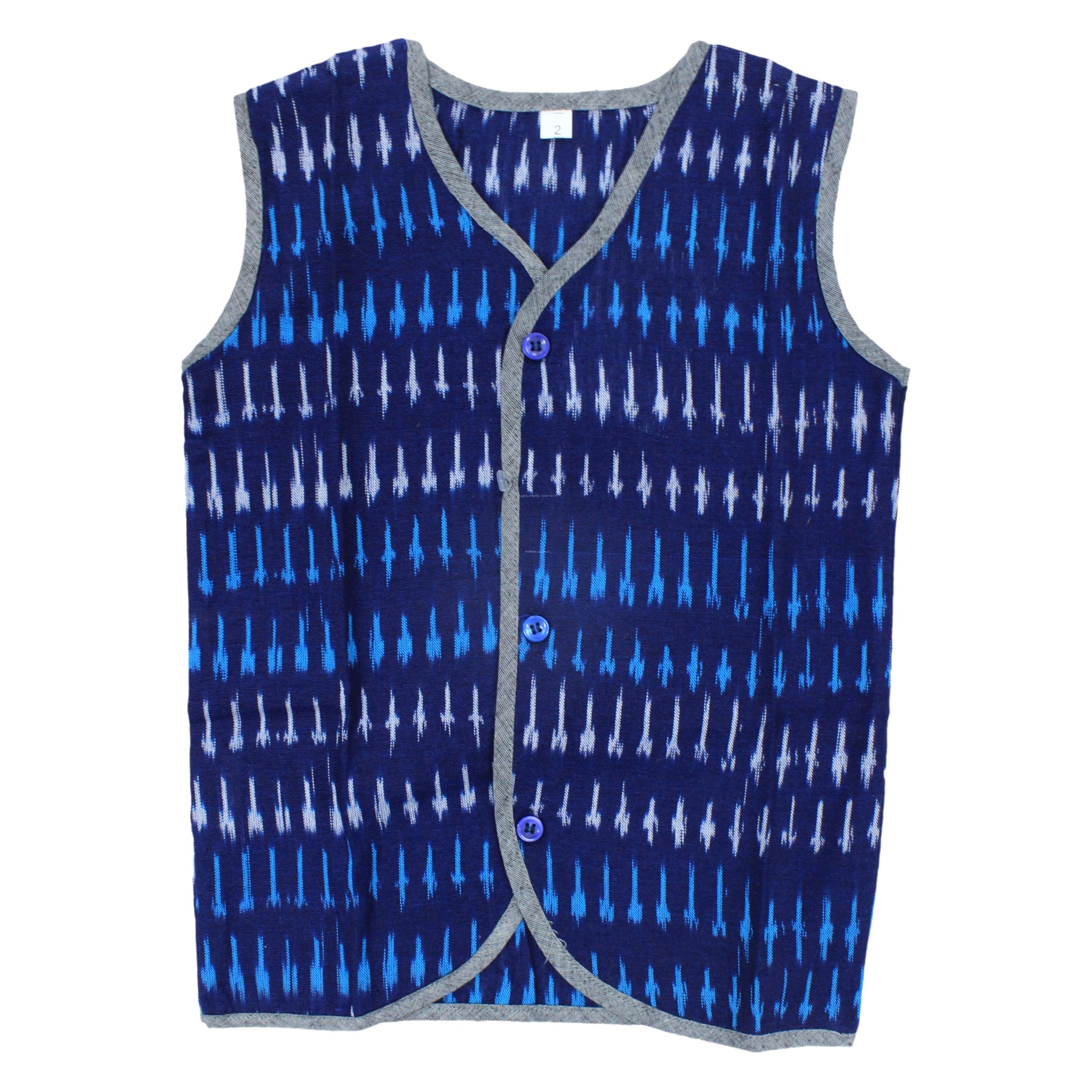 This Boys Ikat Cotton Printed Panjagajam Set comes with a stylish navy blue ikat printed sleeveless vest, detailed with grey contrast piping and front button closure, paired with a solid grey cotton panjagajam finished with a matching ikat border strip. Made from pure ikat cotton, this set is lightweight, breathable, and perfect for traditional wear.